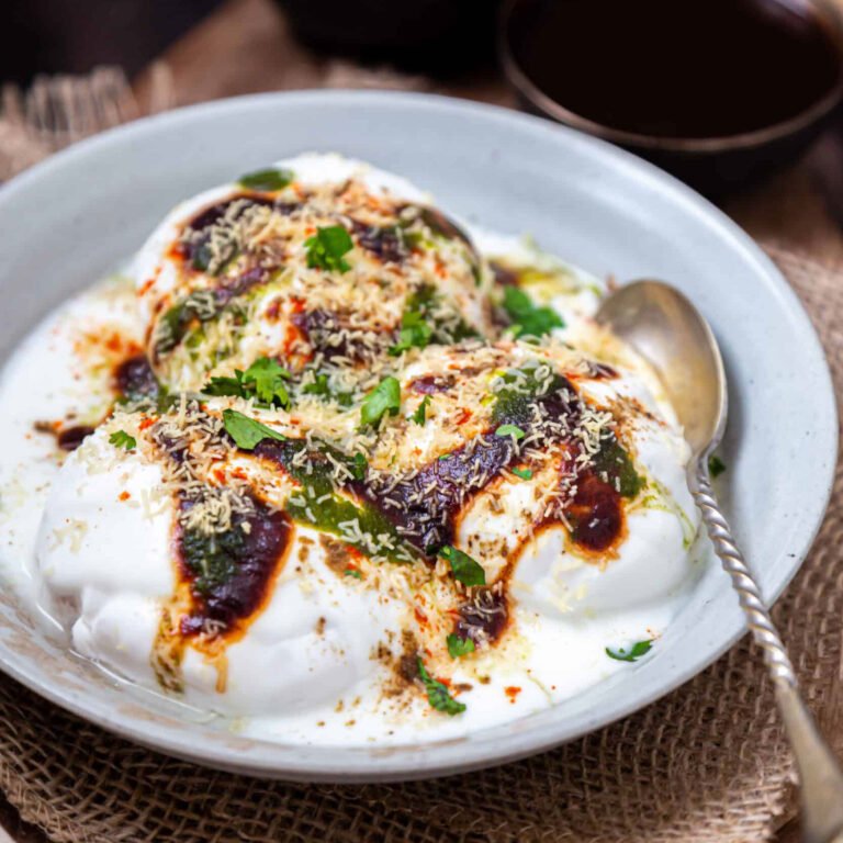 Fried Stuff potato pastry with chickpeas, Tamarind, mint chili and sweet chutney topped with onions, tomato, cilantro