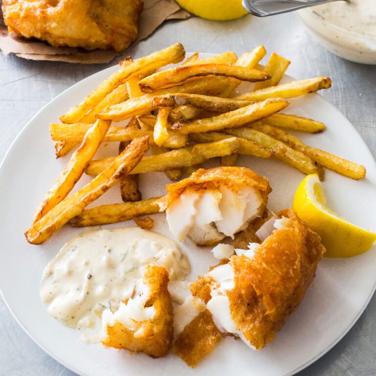 Crispy chicken strips served hot with golden fries and dipping sauce.