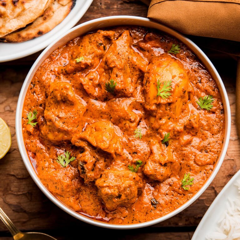 Tender grilled chicken cooked in a creamy tomato and butter sauce with mild aromatic spices.